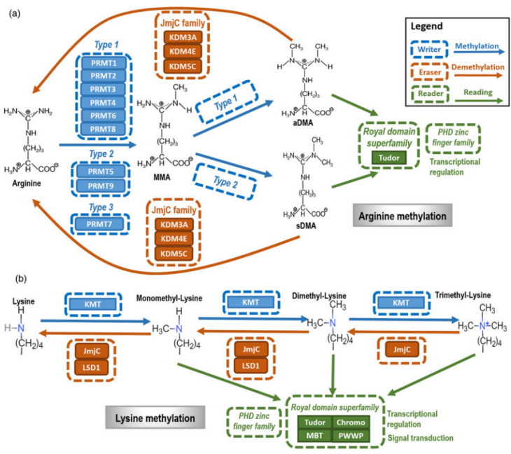 蛋白的甲基化(methylation)是指将甲基酶促转移到蛋白质的某个残基上,通常是赖氨酸或精氨酸,也包括组氨酸、半胱氨酸和天冬酰胺等。甲基化通过调控基因表达、表观遗传、代谢、信号传导及免疫应答,影响细胞功能。异常的调控修饰会导致功能异常,进而导致多种疾病的发生,如肿瘤、神经退行性疾病和心血管疾病等。