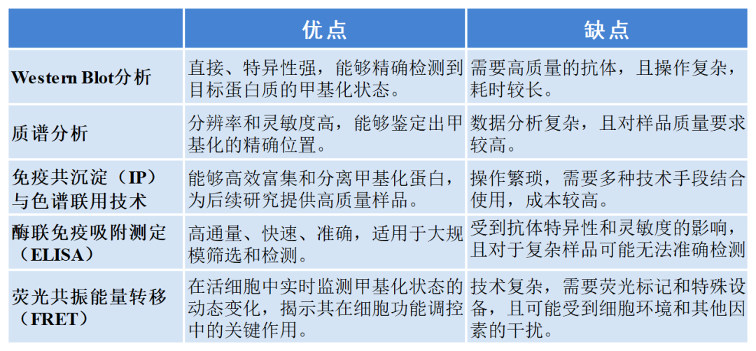 在蛋白甲基化研究中,常见研究方法主要包括WB,质谱,IP,Elisa,和FRET这5种,为了直观清晰地了解这5种方法在研究组蛋白甲基化中的优缺点,特整理了以下表格以供参考。