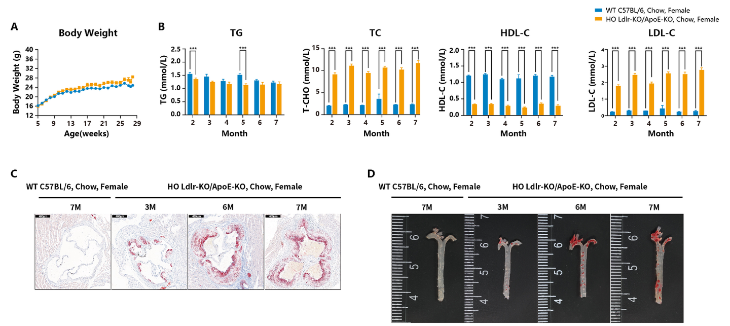 我们建立了动脉粥样硬化小鼠模型,为深入探究动脉粥样硬化的发病机理、药物筛选以及评估药物疗效提供了强有力的工具。部分验证数据如下: