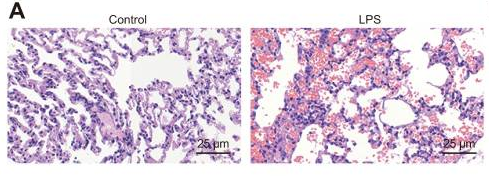 (2)建模方法:腹膜注射1%苯巴比妥进行麻醉,麻醉后一次性#20针头气管滴注LPS(Sigma),剂量为5mg/kg体重(或10ug/50ul LPS),LPS处理24h/48h后处死小鼠取肺组织进行石蜡切片HE染色,观察肺部损伤情况;