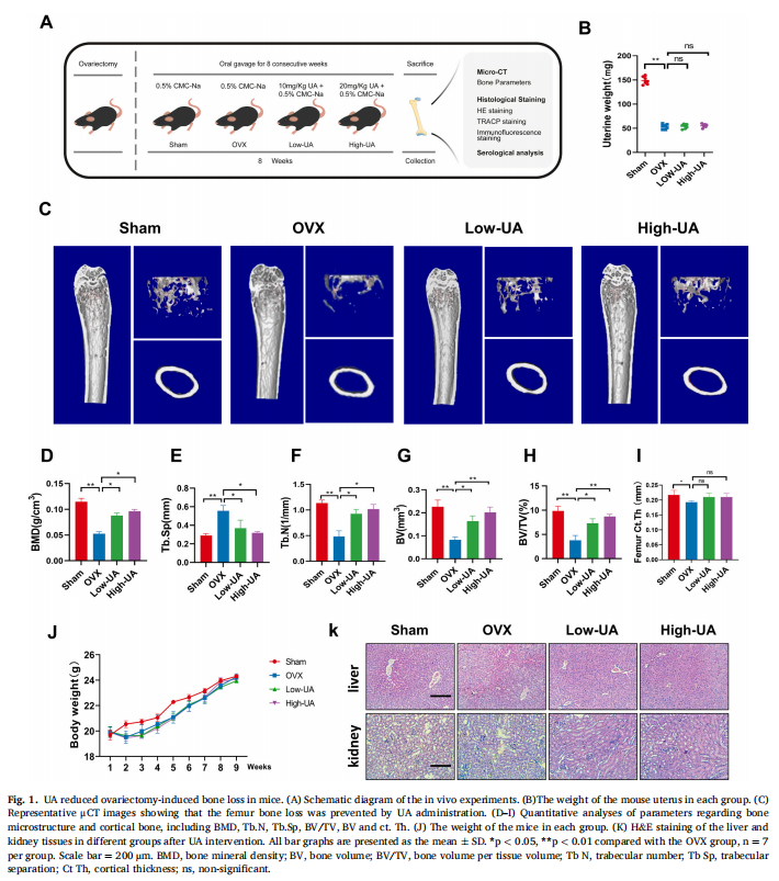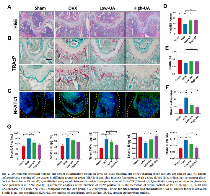 总之,本研究的结果表明,UA是肠道微生物群的一种代谢物,通过抑制破骨细胞的形成来改善卵巢切除术引起的骨质流失。从机制上讲,体外结果显示UA调节巨噬细胞极化并减轻炎症反应。此外,炎症因子的减弱表达阻止了NF-κB的核易位,从而抑制了NLRP3炎症小体触发的细胞焦亡级联反应。更有希望的是,抑制NLRP3炎症小体还可以防止体内OVX小鼠的广泛骨丢失,这意味着调节破骨细胞焦亡可能是一种抑制OP的新治疗策略发病。可以想象,UA给药可能是一种安全且有前景的治疗破骨细胞相关骨病(如OP)的策略。