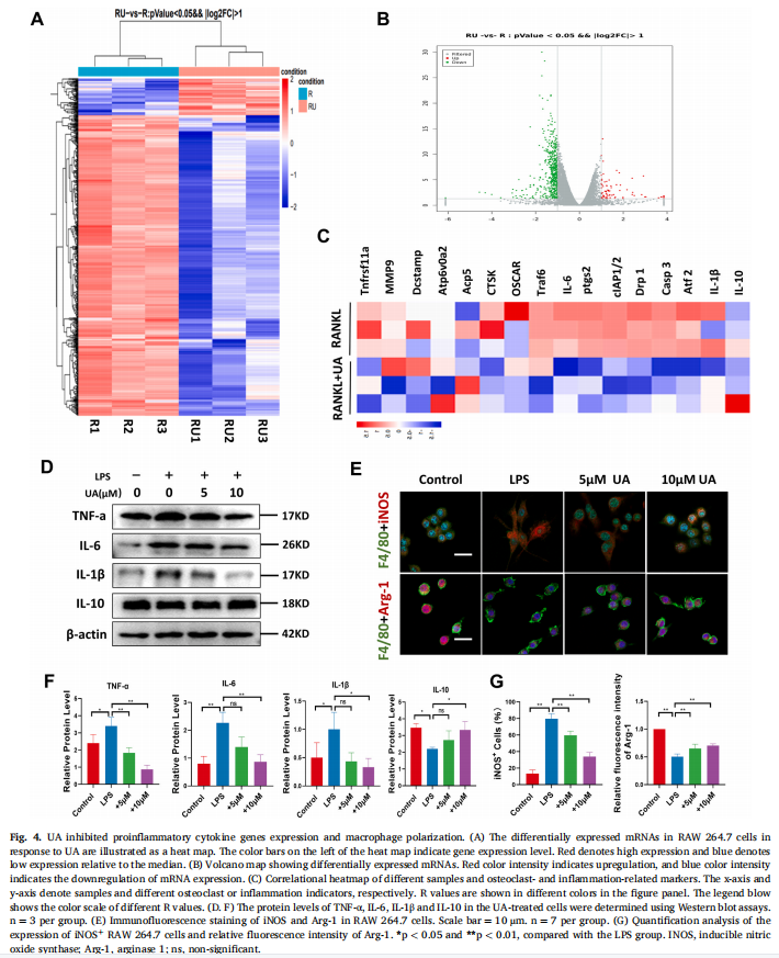 本研究通过卵巢切除术建立了小鼠OP模型,然后用UA治疗OVX小鼠。实验结果显示,UA减少了小鼠卵巢切除术引起的骨质流失(见图一、图二)。作者通过在体外进行了各种细胞干预试验,研究结果表明,UA在体外抑制破骨细胞分化和肌动蛋白带形成(见图三)。为了进一步阐明UA抑制破骨细胞功能的具体机制,在有或没有UA(10 μM)处理的RAW264.7细胞中进行了全转录组RNAseq。两组细胞均用50 μM RANKL处理。研究结果进一步表明,UA抑制促炎细胞因子基因表达和巨噬细胞极化(见图四);UA通过炎症激活的NF-κB通路抑制破骨细胞焦亡(见图五)。考虑到NLRP3炎症小体是导致细胞焦亡的关键因素,作者推测靶向该寡聚体可能构成绝经后OP的潜在治疗方法,选择了MCC950(一种强效的NLRP3抑制剂)并确定了这种小分子的影响。实验结果显示,NLRP3炎症小体抑制缓解破骨细胞生成和雌激素缺乏诱导的OP(见图六)。