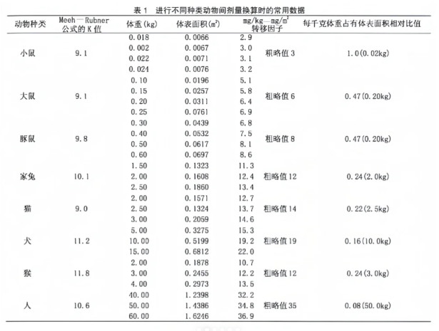 动物的mg/kg剂量乘以相应的转换因子,即为按mg/m2计算的剂量(见如表1第4列)。