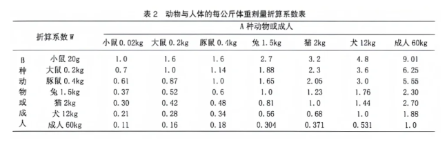 已知A种动物每千克用药量,估算B种动物每千克用药量时,可先查表2,找出折算系数(W),再按下式计算:B种动物的剂量(mg/kg)=W*A种动物的剂量(mg/kg)