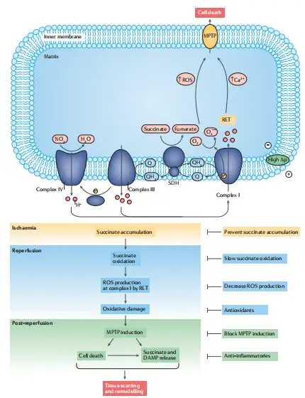 因此,减缓再灌注损伤有以下方案:在缺血时,预防琥珀酸积累;在再灌注时,避免琥珀酸氧化,减少ROS生成,或添加氧化剂,避免氧化损伤;及再灌注后,注射阻断MPTP通路相关药物,避免细胞死亡,或直接注射抗炎药物等方式,防治再灌注损伤。但是应用于临床结果令人失望,分析其原因可能是动物实验使用的模型过于年轻,缺乏老年人,不健康患者的相关共性。或是患者同时服用多种药物,与被检测药物可能效果相似,导致无法正确评估药效。还有可能是治疗前缺血时间太长或太短,影响判断结果。另外,CSA药物进入线粒体速度太慢,无法阻止细胞损伤,需要迅速给药。