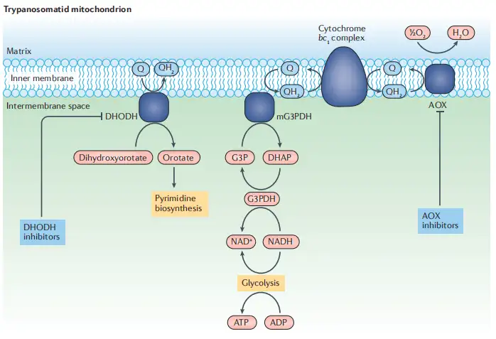 锥虫的线粒体是一个很有吸引力的药物靶点,因为它们有不同的代谢模式,这取决于宿主和生命周期的阶段,并且与人类线粒体不同。寄生虫感染的人血液的阶段是依赖糖酵解产生ATP,它包含一个线粒体,该线粒体具有一个非常规的呼吸链,对于从NADH再生NAD+以维持糖酵解至关重要,而人体内AOX的缺乏使其成为一个有吸引力的药物靶点(如下图)。