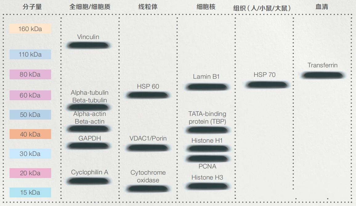 目标蛋白和内参蛋白大小相当的话,WB 结果无法直接观察,很难进行准确数据的分析。因此要选择分子量与目的蛋白质差异较大的内参抗体,以确保两种蛋白质在检测过程中不会重叠。