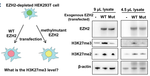 体外甲基化--EZH2的自动甲基化对于新生H3K27me3沉积至关重要实验将野生型(WT)或甲基突变型(Mut)EZH2质粒转染到EZH2耗尽的HEK293T菌株中。结果表明,在EZH2耗尽的菌株中,H3K27me3的丢失被WT EZH2挽救,但不能被甲基化突变体EZH2挽救[2]。