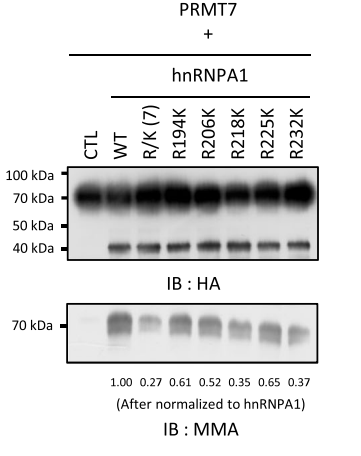 通过构建hnRNPA1每个位点(R194K、R206K、R218K、R225K和R232K)或全部五个精氨酸位点被赖氨酸替换(R/K (7))的突变体,将纯化的PRMT7蛋白与hnRNPA1(野生型)或突变体混合进行体外甲基化实验。结果发现单一位点突变减弱了PRMT7介导的甲基化,而所有五个精氨酸位点被替换的突变体具有 最显著的减弱效果,表明PRMT7在hnRNPA1中调控的五个精氨酸位点可以在体外得到验证。[3]
