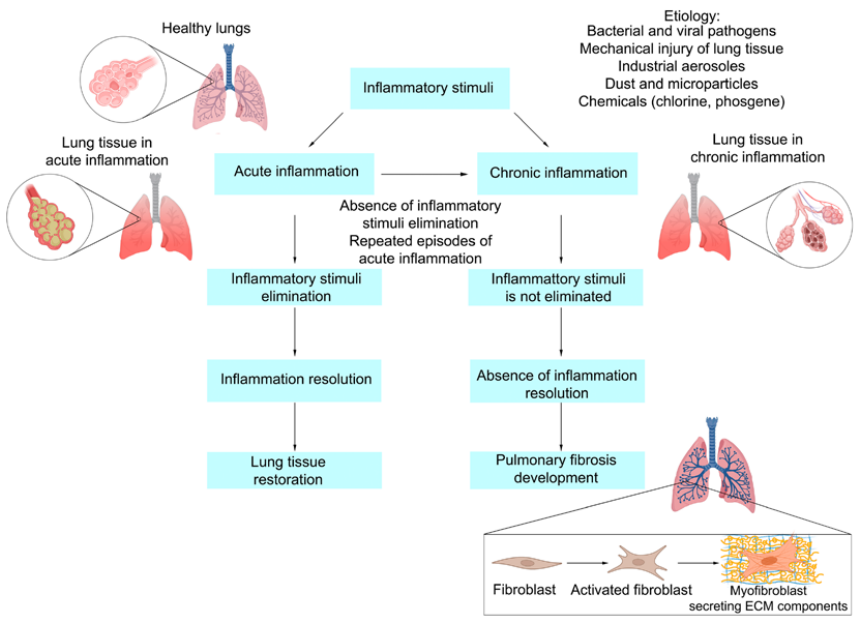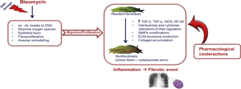 在科研工作中,博来霉素、百草枯、高浓度氧、石棉等均可以作为诱导剂来引起肺纤维化,其中以博来霉素最为常用。博莱霉素(bleomycin,BLM)是一种肿瘤药物,对肺部存在毒性副作用。该药可以诱导DNA的断裂与氧化应激反应,从而引起实质炎症、上皮细胞损伤伴反应性增生、上皮-间充质转化、成纤维细胞活化并分化为肌成纤维细胞,以及基底膜和肺泡上皮损伤等症状。