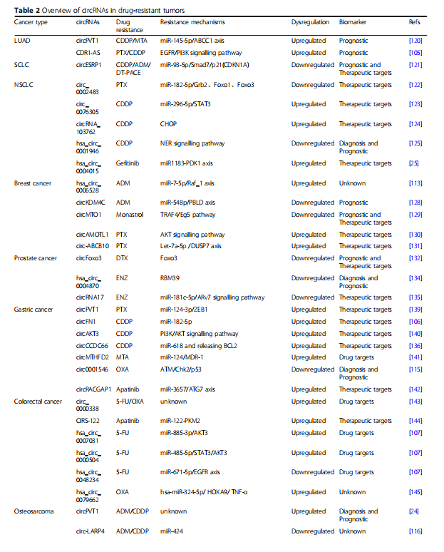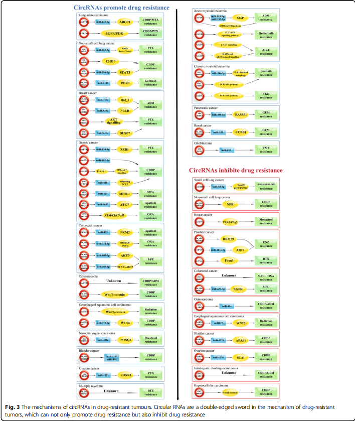 CircRNAs的独特性质和生物学功能表明了其在肿瘤发生、肿瘤生长、转移、侵袭、耐药和抗辐射中的重要性。此外,这些结果表明CircRNAs可能成为新的肿瘤生物标志物或治疗靶点。如图所示。在图3和表2中,我们总结了CircRNAs在耐药肿瘤中的潜在作用机制,为临床治疗策略提供证据。