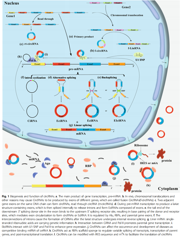 大多数CircRNA在形成后输出到细胞质中,充当miRNA海绵,与RBP结合,或编码蛋白质。CircRNAs可以依靠m