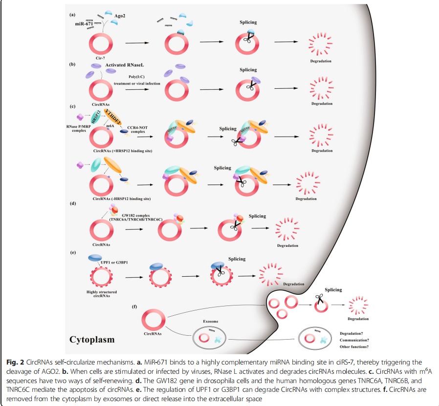 此外,研究表明,CircRNA可以通过外体从细胞中分泌出来;这些CircRNA大多通过外来体介导细胞间的通讯。然而,尚不清楚该事件是否与CircRNA的自我调节有关,以及这些CircRNA的降解是否影响其细胞功能。