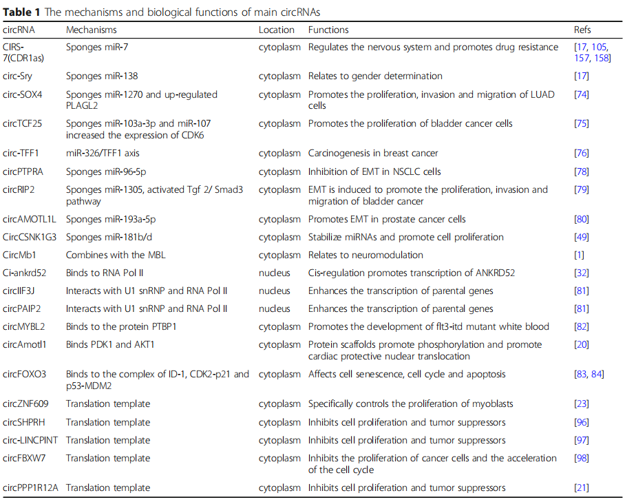 随着研究的进展,环状RNA的各种生物学功能已被揭示。环状RNAs可以作为microRNAs(miRNAs)的“海绵”,影响miRNA靶基因的功能。此外,环状RNA可以与特异性的RNA结合蛋白(RBPs)结合,从而影响亲本基因的功能。有趣的是,越来越多的证据表明,环状RNA可以编码参与肿瘤发病机制和进展的蛋白质/多肽。环状RNA的独特特性和生物学功能表明了环状RNA在肿瘤发生、增殖、转移、侵袭和耐药性中的重要性,这也表明环状RNA有可能作为生物标志物和肿瘤治疗靶点。