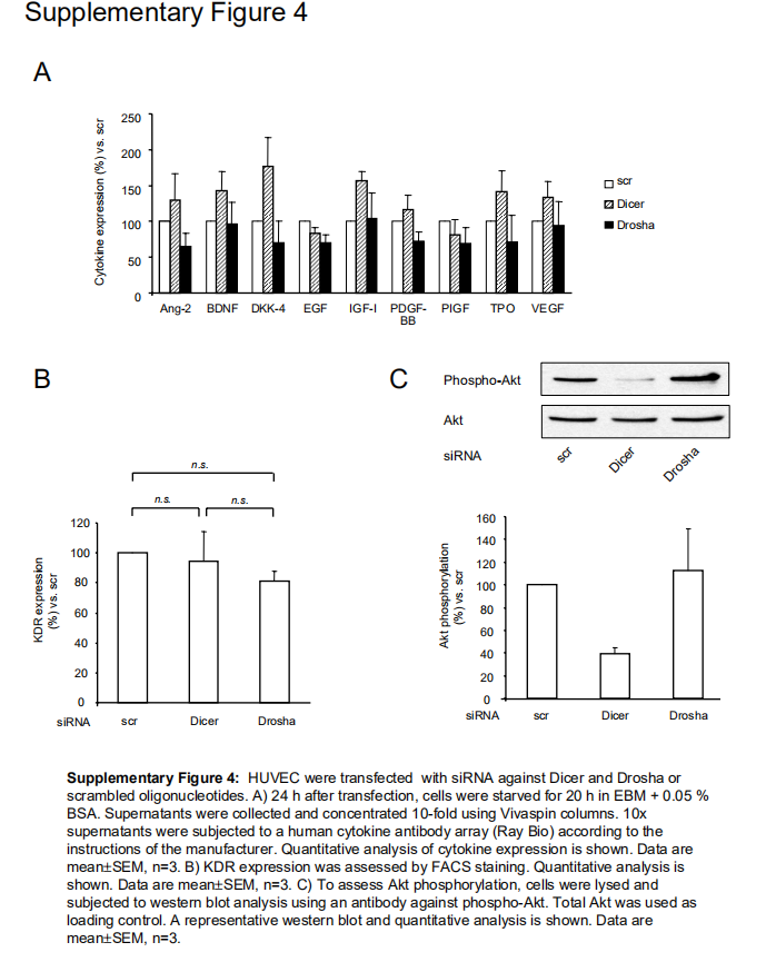 最后,再次使用人细胞因子阵列阐明了Dicer和Drosha对血管生成生长因子表达的影响。尽管Dicer siRNA显著抑制血管生成,但Dicer沉默的内皮细胞中大多数促血管生成细胞因子均增加(补充图IVA)。此外,未检测到VEGF受体2表达的显著差异(补充图IVB)。相反,与Drosha siRNA处理的细胞相比,在Dicer siRNA中Akt磷酸化被选择性抑制(补充图IVC),表明Dicer干扰了Akt活化。