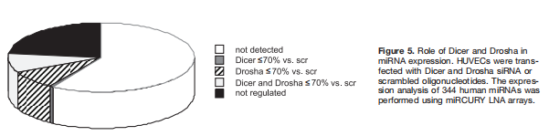 miRNAs是由两种主要酶Dicer和Drosha介导的两步处理途径中产生的,它们属于RNAseIII内切酶类。虽然Drosha在体内的功能目前尚不清楚,但Dicer在脊椎动物的发育中起着至关重要的作用。双基因缺陷小鼠在胚胎发育早期死亡,在胚胎第12.5-14.5天之间,显示血管和卵黄囊形成受损。斑马鱼Dicer突变胚胎在原肠形成、大脑形成、体细胞发生和心脏发育过程中表现出异常的形态发生。最近的一项研究表明,mir-221和mir-222调节人脐静脉内皮细胞的血管生成特性(HUVECs)。然而,miRNAs在内皮细胞生物学中的功能尚不清楚。因此,本文主要研究mirna调节酶Dicer和Drosha在内皮细胞血管生成功能中的作用。研究结果表明,Dicer和Drosha在体外是内皮芽和网络形成的关键调控因子,而只有DicersiRNA在体内显著阻断了血管生成。