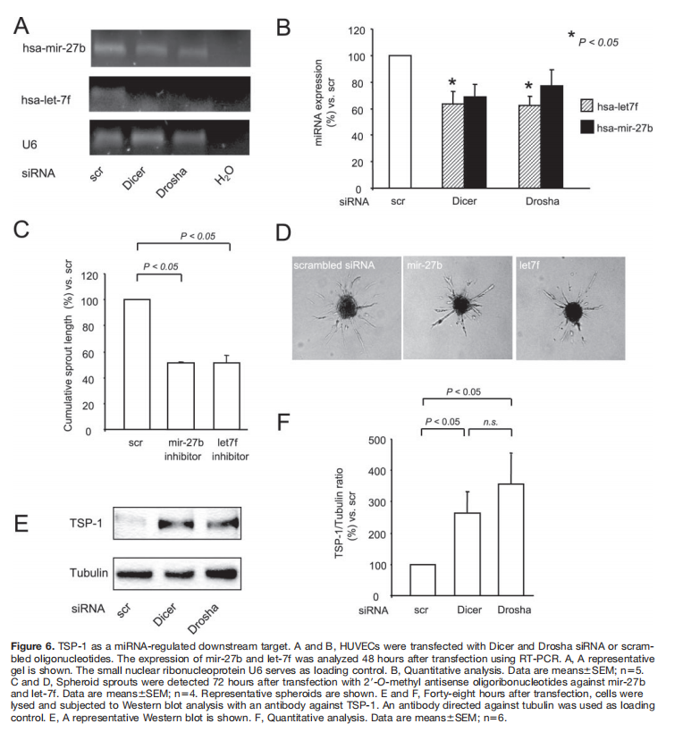 本研究证明了Dicer和Drosha在体外参与血管生成的调节。Dicer表达沉默还会损害体内血管生成,而Drosha耗竭未产生显著影响。对内皮细胞中高表达miRNA的分析提供了证据,表明miRNA let-7f和hsa-mir-27b受到Drosha和Dicer siRNA的显著下调。根据推测的let-7靶点的计算机预测,我们的数据表明Dicer和Drosha通过let-7家族成员调节血管生成抑制剂TSP-1。