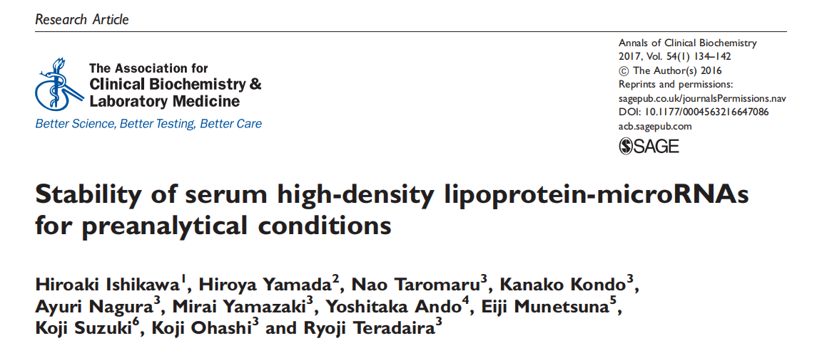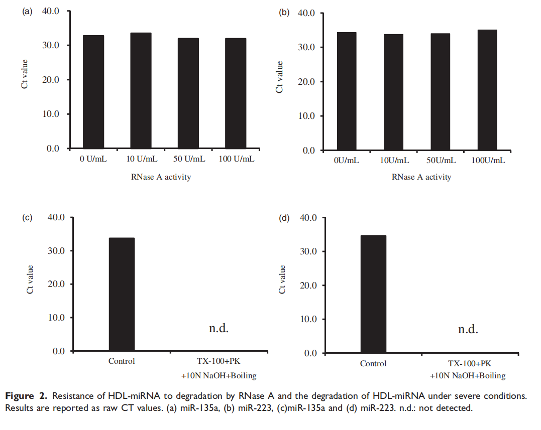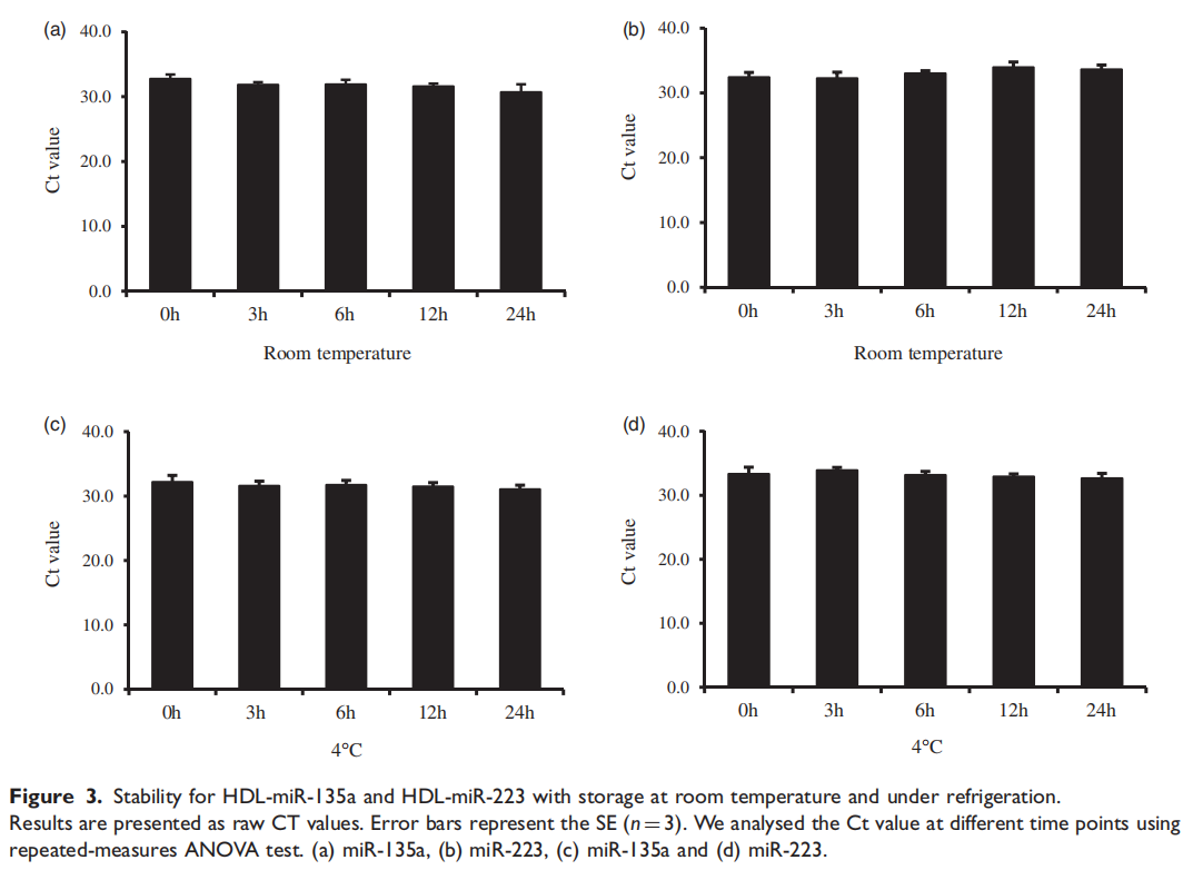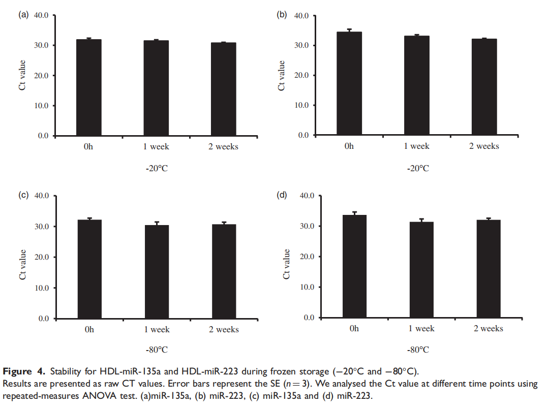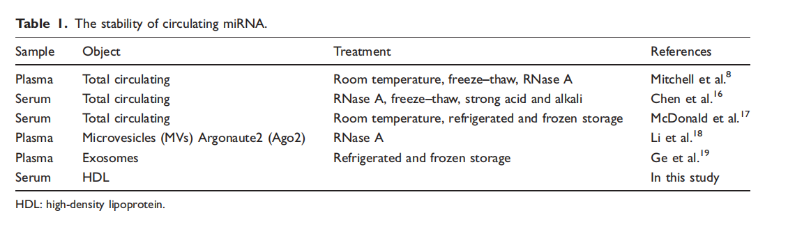 关于循环miRNAs的临床应用,研究已积极开展。例如,总循环miRNAs似乎对pH、温度、冷冻和冻融、内源性核糖核酸酶(RNAse)和各种储存条件具有耐药性(表1)。外泌体miRNAs也可以防止冷藏和冷冻储存。鉴于这些报告,总循环miRNAs,外泌体miRNAs和MVs-miRNA可以是诊断各种疾病的非侵入性生物标志物。然而,尽管HDL-miRNAs的表达谱可能提供了关键信息,但分析前的条件如存储温度和时间是否会影响HDL-miRNAs的稳定性尚不清楚。因此,为了将HDL-miRNAs应用于临床检查,检查稳定性至关重要。在本研究中,我们研究了HDL-miRNAs在不同存储条件下的稳定性,因为这是其应用于临床研究领域的一个重要问题。