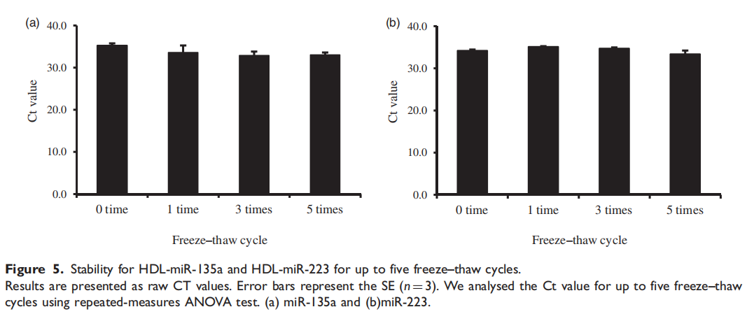 结果:RNAseA处理(0-100U/mL)对高密度脂蛋白中microRNAs的浓度没有改变。在室温或4C保存0-24h后,这些microRNAs没有显著变化,冷冻保存两周也有类似的结果。此外,高密度脂蛋白-microRNAs至少稳定了5个冻融周期。
