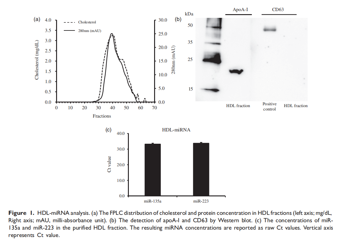在这里,我们证明了HDL中的miRNAs在不同的样品存储条件下是稳定的。具体来说,本研究的结果已经阐明了HDL-miRNAs在RNAseA处理和血清样本的各种储存条件下是稳定的,如室温、冷冻、冷冻储存和反复冻融循环。高密度脂蛋白的主要功能是去除外周组织中多余的胆固醇,并将其送回肝脏进行储存和排泄。高密度脂蛋白主要参与体内胆固醇水平的调节。此外,高密度脂蛋白在抗炎作用、抗氧化作用和改善内皮功能中也发挥了重要作用。