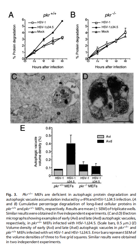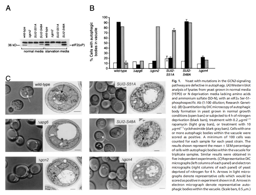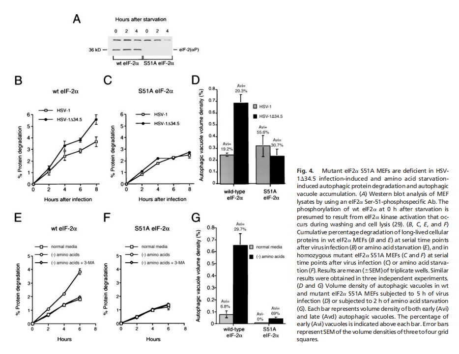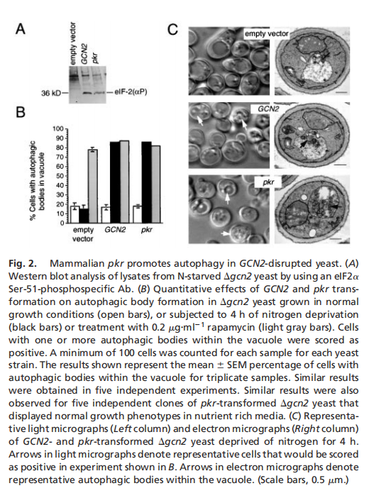 实验结果表明,酵母eIF2α激酶信号通路对于饥饿诱导的自噬是必不可少的,eIF2α激酶、GCN2及其磷酸化靶位点eIF2α的Ser-51,对于酵母中饥饿诱导的自噬至关重要。GCN2依赖的转录反激活因子GCN4,而不是转录抑制,对酵母中饥饿诱导的自噬至关重要。酵母在突变GCN2 -7号信令通路是细胞自噬缺陷(见图一);哺乳动物IFN诱导的eIF2激酶PKR促进gcn2破坏的酵母菌的自噬(见图二);PKR是病毒诱导的mef自噬所必需的,它被HSV-1编码的PKR抑制剂和神经毒性蛋白ICP34.5阻断(见图三);eIF2Ser-51是mef中病毒诱导和氨基酸饥饿诱导的自噬所必需的(见图四)。