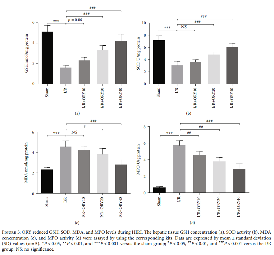 本研究旨在探讨γ-谷维素(ORY)对肝缺血再灌注(HIR)损伤的保护作用及其可能的保护机制。 ORY是从米糠油中分离出来的一种重要的生物活性成分,具有抗炎、抗凋亡的作用。 然而,目前尚不清楚ORY是否能保护肝脏免受HIR损伤。 在本研究中,口服ori七天,之后对动物进行肝脏缺血60分钟和再灌注6小时。 对相关指标进行分析。 结果表明,ORY预处理能显著降低AST、ALT水平,减轻肝细胞损伤和凋亡,减轻SOD、GSH的耗竭以及MDA、MPO的积累。 有趣的是,ORY治疗可以显著降低ER应激。 此外,ORY预处理显著降低HMGB1、NLRP3、caspase1(p20)和IL-1β的蛋白表达,保护肝脏免受I/R诱导的炎性小体激活和凋亡。 总之,本研究证明了ORY在调节氧化应激、内质网应激和炎症体中的潜在作用。