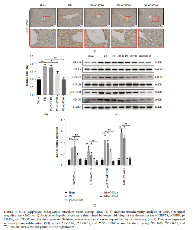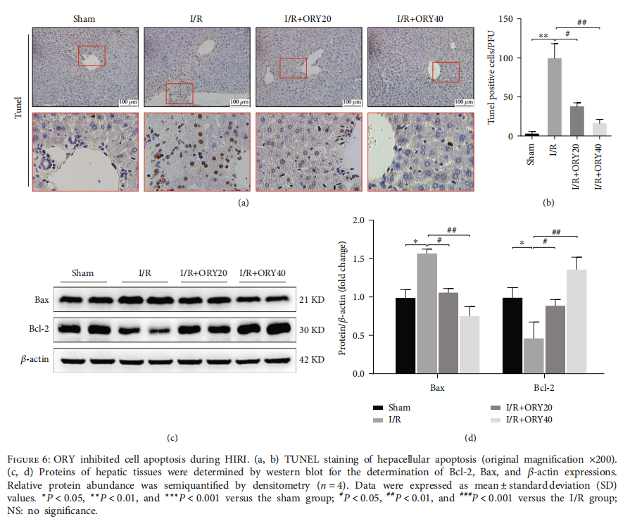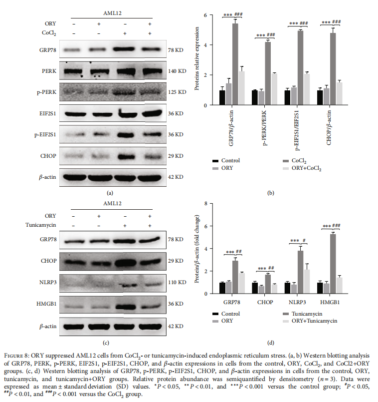本研究通过建立HIR大鼠模型,进行ORY干预。结果显示,ORY减轻I/R诱导的小鼠肝损伤(见图二);ORY在HIRI期间降低了GSH、SOD、MDA和MPO水平(见图三)、抑制内质网应激(见图四)、减弱了HMGB1/NLRP3炎症小体(见图五)、抑制细胞凋亡(见图六); ORY保护AML12细胞免受氯化钴诱导的缺氧损伤(见图七);ORY抑制来自CoCl2或衣霉素诱导的内质网应激的AML12细胞(见图八)。