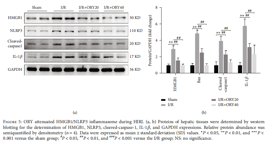综上所述,本研究表明,ORY首次改善了I/R诱导的肝损伤。在机械方面,ORY减轻了I/R诱导的肝脏ER应激。此外,ORY预处理显著降低了HMGB1、NLRP3、caspase-1 (p20)、IL-1β的蛋白表达,保护肝脏免受I/R诱导的炎性小体激活和凋亡(见图九)。基于我们的数据,ori预处理将为理解HIRI的治疗和预防提供一个新的视角。