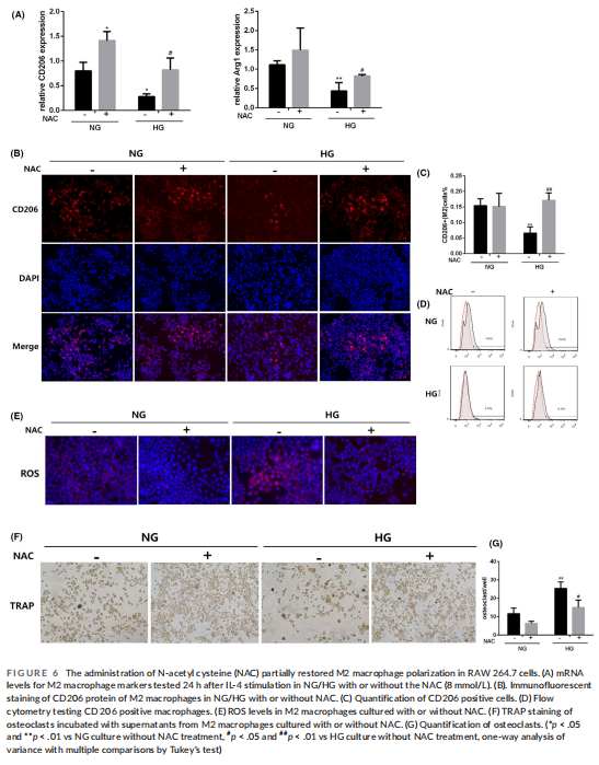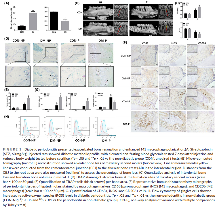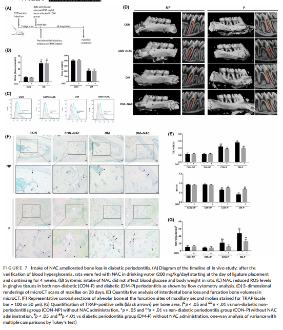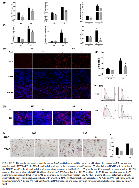 本研究通过在SD大鼠中注射链脲佐菌素(STZ,60mg/kg)诱导1型糖尿病。N-乙酰半胱氨酸(NAC)治疗组的大鼠接受溶解在饮用水中的NAC(200毫克/公斤/天)。通过在左上颌第二磨牙周围结扎3-0丝4周诱导实验性牙周炎。结果显示:与载体治疗的大鼠相比,糖尿病大鼠在牙周病变中显示出增强的巨噬细胞浸润和M1巨噬细胞极化(见图一)。在LPS或IL-4刺激下,RAW264.7的高糖培养提高了ROS水平并增加了M1巨噬细胞Advertisement标志物(iNOS、TNF-α和IL-6)的表达,而降低了M2巨噬细胞标志物(Arg-1和CD206)(见图二、三)。与正常葡萄糖培养的细胞相比,高糖处理的M1/M2巨噬细胞的上清液增强了破骨细胞的形成(见图四)。通过NAC降低ROS水平部分逆转了高葡萄糖对M1/M2巨噬细胞极化的影响(见图五)。同时,在啮齿动物模型中每天摄入NAC抑制了M1巨噬细胞极化(见图六),随后改善了糖尿病大鼠牙周炎的牙槽骨丢失和破骨细胞数量(见图七、八)。