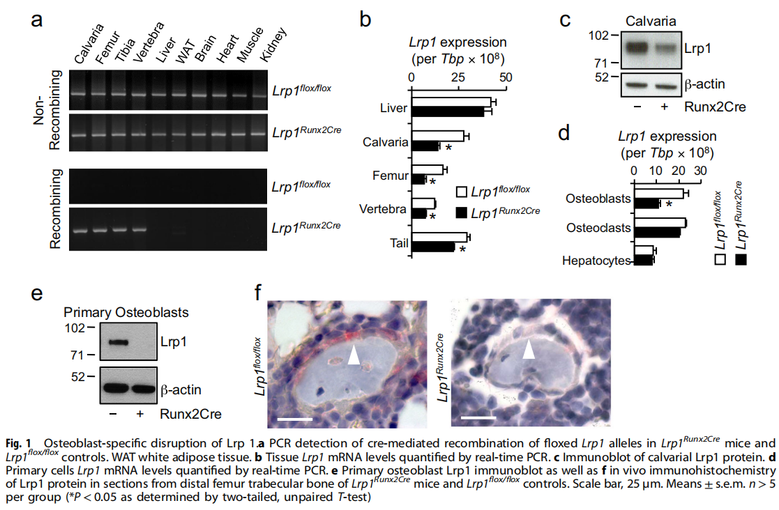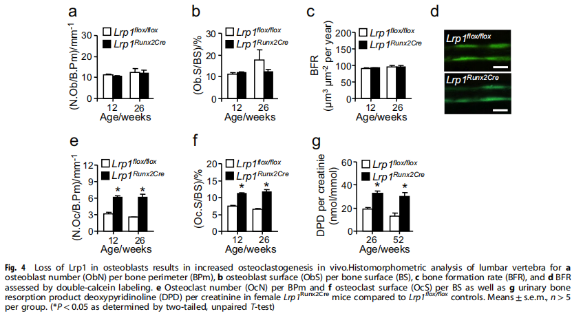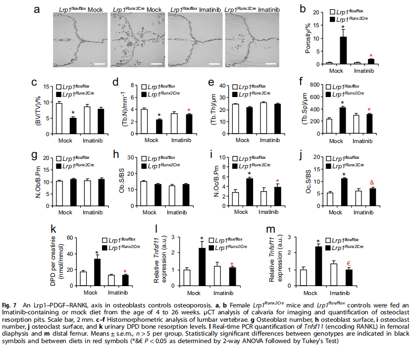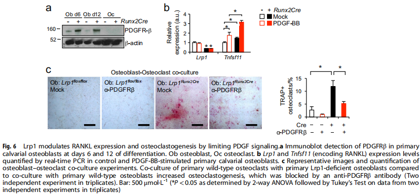 本研究结果显示,通过用于研究成骨细胞Lrp1的条件转基因小鼠模型的生成(见图一),检测Lrp1Runx2Cre小鼠缺乏成骨细胞Lrp1的小鼠的脂蛋白代谢(见图二)、缺乏成骨细胞Lrp1的小鼠的骨质疏松症(见图三)。实验结果进一步证实了成骨细胞中的Lrp1表达对于控制破骨细胞生成至关重要(见图四),也表明成骨细胞中的Lrp1缺失导致骨内RANKL水平局部增加(见图五)。本研究发现PDGF信号传导是成骨细胞Lrp1在体外对破骨细胞的影响的重要介质(见图六)。本研究结果又进一步证实,用伊马替尼治疗缺乏成骨细胞Lrp1的小鼠导致骨质疏松症缓解(见图七);