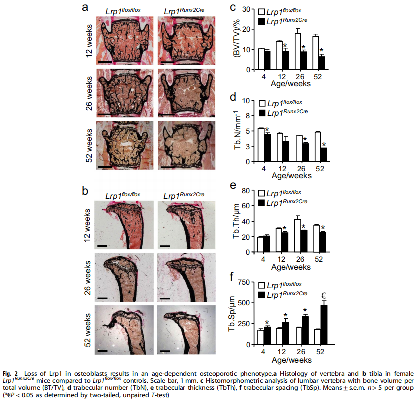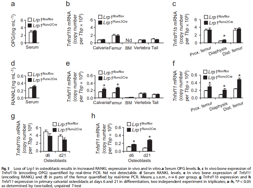 在骨质疏松症和肿瘤相关的骨溶解中,骨吸收优于骨形成,导致骨量低、骨结构差和骨折风险增加。RANKL是由成骨细胞谱系的细胞合成的必需破骨细胞分化和活化因子及其作用通过结合其可溶性诱饵受体骨保护素(OPG)平衡。遗传研究已将编码低密度脂蛋白受体相关蛋白1(Lrp1)的基因与骨骼特征联系起来,但这些关联是否基于因果分子关系尚不清楚。Lrp1是低密度脂蛋白(LDL)受体(LDLR)家族的多功能成员,全身缺乏Lrp1的小鼠不能存活。使用条件性基因靶向,Lrp1的几种功能已在小鼠中解开,其中包括在清除血浆残余脂蛋白中的内吞作用通过与细胞表面其他受体的相互作用,Lrp1还可以调节细胞信号通路。因此,已经描述了通过调节血小板衍生生长因子(PDGF)受体-β(PDGFRβ)稳定性和信号传导,Lrp1在血管壁中具有动脉粥样硬化保护作用。关于骨骼系统,已经表明,LRP1充当被人成骨细胞高表达脂蛋白受体和最近的体外研究表明LRP1的软骨细胞分化的作用尽管有这些报道,但没有体内证据,例如来自转基因动物模型,Lrp1在骨骼生物学中的明确意义。在这里,通过遗传方法分析了Lrp1在体内成骨细胞中的功能,并证明成骨细胞Lrp1通过限制成骨细胞-破骨细胞通讯中的新型PDGF-RANKL信号轴来防止骨质疏松症。