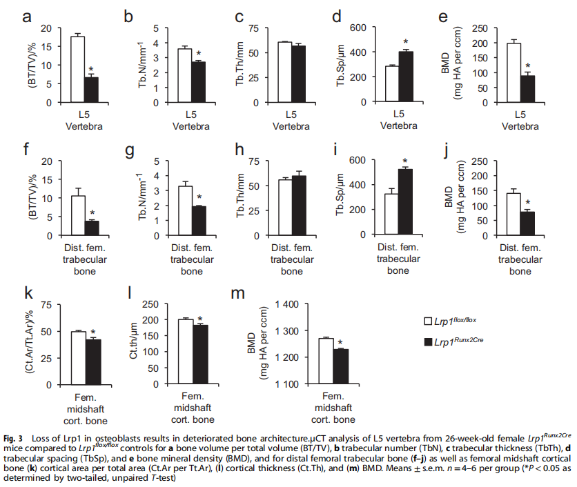 尽管本文中提供了体内和体外证据表明主要是PDGF-BBPDGFRβ信号传导介导成骨细胞Lrp1缺乏对通过破骨细胞控制骨量的影响,但基于与Lrp1结合的配体的多样性和共Lrp1相互作用的受体,不排除其他信号通路也可能受成骨细胞中的Lrp1调节。重要的是要指出,与成骨细胞相比,破骨细胞中的Lrp1是可有可无的,因为在破骨细胞中缺乏Lrp1的小鼠中没有发现任何异常的骨骼改变。这意味着在成骨细胞谱系中靶向Lrp1介导的通路可能代表治疗骨质流失的一种新的和安全的途径。
