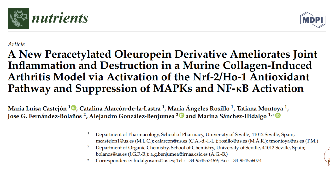 橄榄苦苷(OL)、橄榄树二环萜类化合物及其全乙酰化衍生物(Per-OL)对LPS刺激的巨噬细胞和小鼠实验性系统性红斑狼疮(SLE)表现出多种有益作用。本研究旨在评估膳食Per-OL与OL补充剂对胶原诱导性关节炎(CIA)小鼠模型的影响。三周大的DBA-1/J雄性小鼠在断奶后使用标准商业饮食或0.05%(w/w)的实验性强化饮食喂养)OL,0.05%和0.025% Per-OL。预处理六周后,通过尾基注射(第0天)由牛II型胶原蛋白诱导关节炎,并在第21天对小鼠进行加强注射。第一次免疫后42天处死小鼠。Per-OL和OL饮食都显着防止了组织学损伤和关节炎评分的发展,尽管两种化合物之间没有观察到统计学上的显着差异。此外,血清胶原寡聚基质蛋白(COMP)、金属蛋白酶(MMP)-3和促炎细胞因子水平在来自secoiridoids喂养的动物的爪子中得到改善。丝裂原活化蛋白激酶(MAPK)和核转录因子-κ-B(NF-κB)激活显着下调,而核因子E2相关因子2(Nrf2)和血红素加氧酶-1(HO-1)在那些喂食OL和Per-OL饮食的小鼠中,蛋白质表达上调。我们得出结论,Per-OL及其母体化合物OL补充剂可能为开发预防类风湿性关节炎的新饮食策略提供基础。