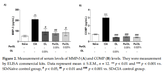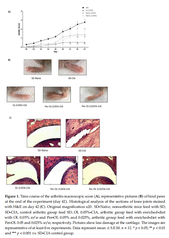 总之,本研究首次通过减少关节炎损伤、血清促炎生物标志物(MMP-3和COMP)、细胞因子产生(IL-6,IL-1β,TNF-α,IFN-γ,IL-17),并抑制iNOS和COX-2过表达。这些有益作用所涉及的可能作用机制可能与抗氧化剂Nrf2/HO-1通路的激活以及MAPK和NF-κB信号通路的阻断有关。本文研究结果为Per-OL与OL相比具有更好的抗关节炎特性提供了证据,并证实了它们作为预防和管理RA的一种新的有前途的饮食策略的潜力。
