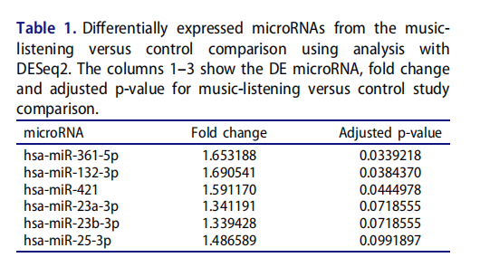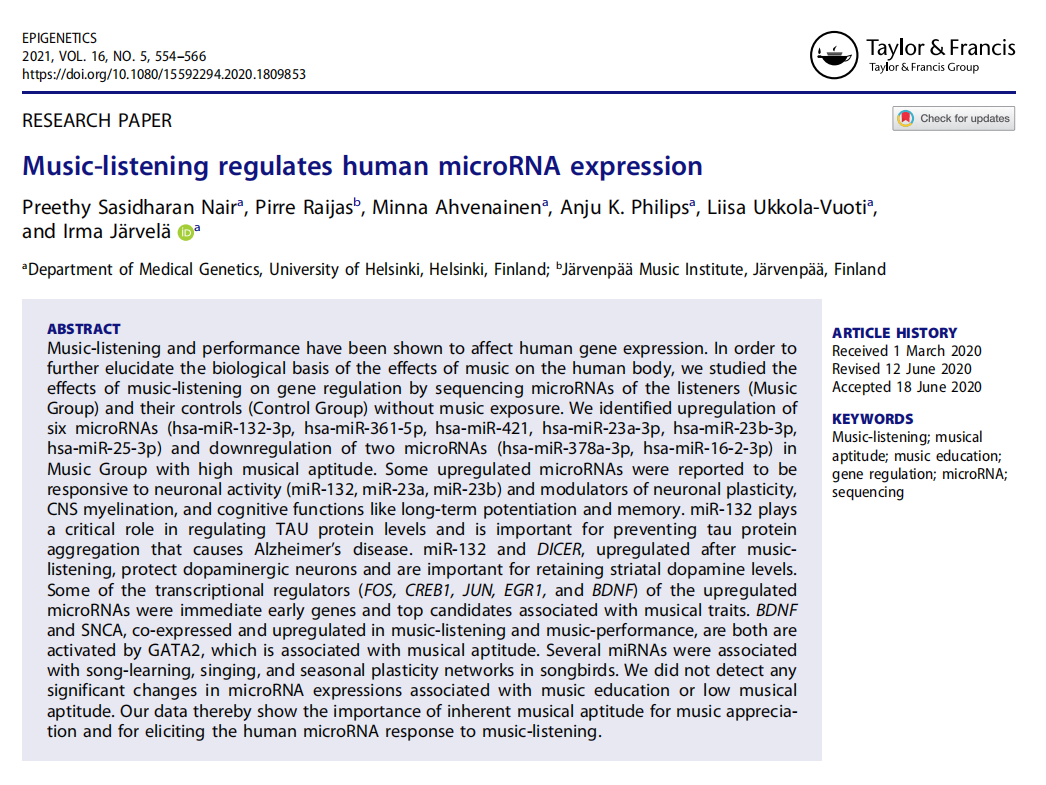 从遗传的角度来看,音乐是一种表观遗传调节剂,可能会影响人类基因及其调控。microRNA在人类神经系统的发育和突触可塑性中的调节作用得到了很好的研究。MicroRNAs也参与内耳发育和耳朵的感觉功能。之前研究表明,由听音乐和音乐表演激活的基因参与多巴胺能神经传递、长时程增强、突触可塑性和记忆。