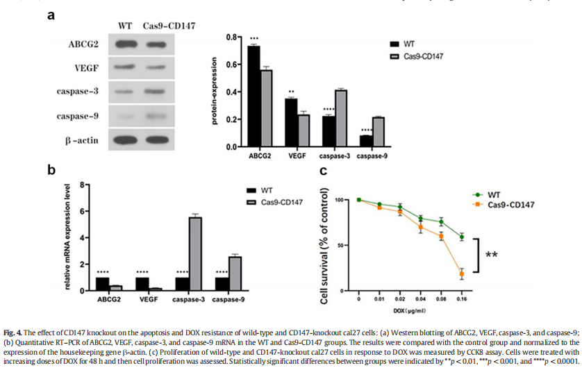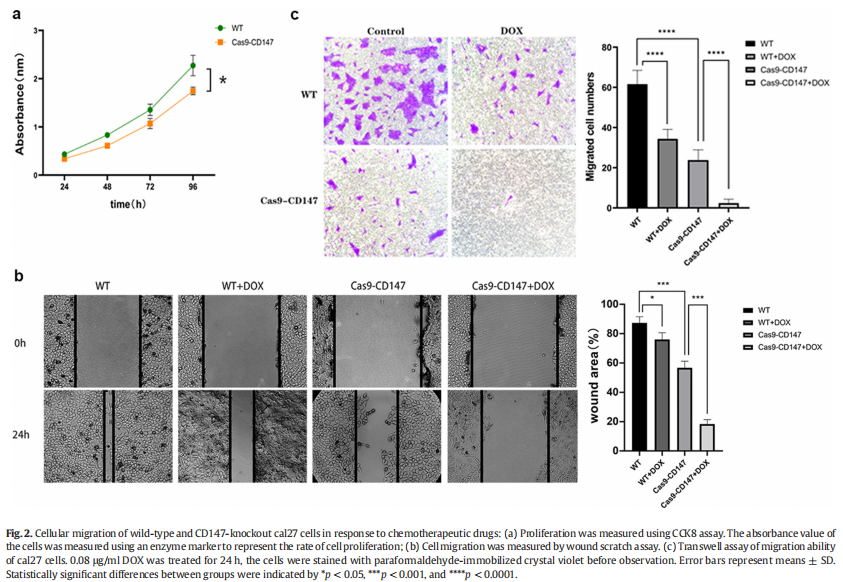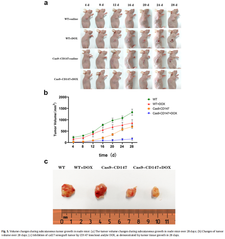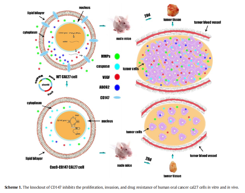 本研究利用CRISPR/Cas9基因敲除工具在体外和体内证明CD147敲除抑制口腔癌的增殖、侵袭和DOX耐药。因此,CD147有望成为治疗口腔癌的靶点。这项研究首次证明CRISPR基因编辑技术敲除CD147。虽然该技术可以有效检测CD147基因在口腔鳞癌cal27细胞中的生物学效应,但能否成为有效的治疗策略仍有待阐明。更重要的是,如何有效地利用CRISPR基因编辑技术,并将其应用于各种疾病的治疗是至关重要的。