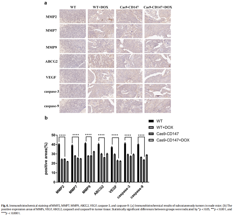 本研究采用CRISPR/Cas9基因编辑技术创建CD147敲除Cal27细胞系(见图一)。结果显示,CD147敲除减少Cal27细胞的增殖和迁移(见图二)、抑制Cal27细胞的侵袭(见图三)、降低Cal27细胞凋亡(见图四)、抑制Cal27细胞的DOX抗性(见图二、三、四);体外动物实验结果显示,Cas9-CD147Cal27细胞在口腔癌小鼠模型中表现出较慢的生长和较少的侵袭(见图五、六)。