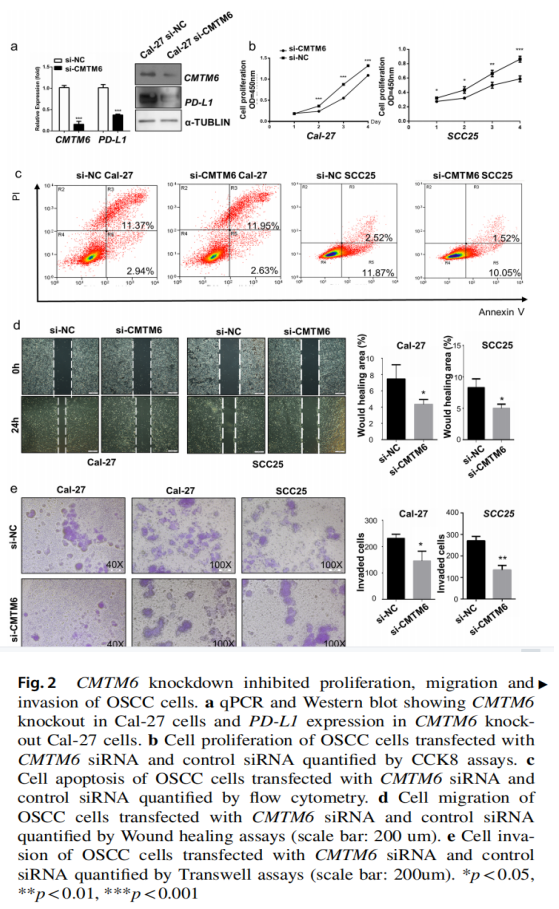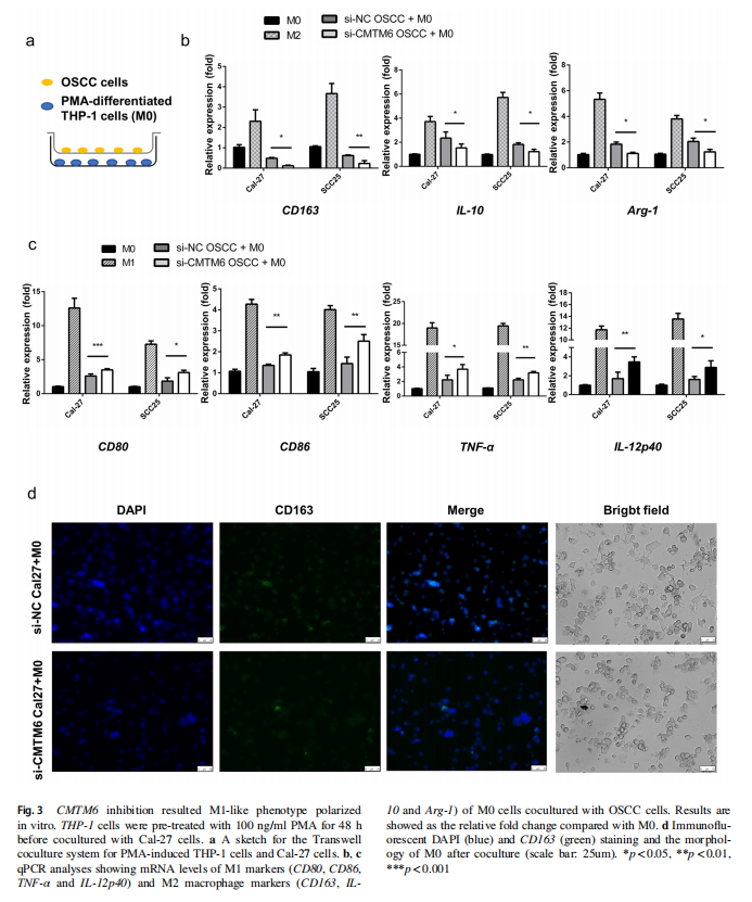 在OSCC样本中,CMTM6表达与OSCC患者的CD163+巨噬细胞浸润和临床特征呈正相关(见表一、表二、图一);OSCC细胞中的CMTM6敲低通过PD-L1下调减缓OSCC癌症进展(见图二)。OSCC细胞的CMTM6敲低抑制了OSCC细胞的增殖、迁移和侵袭能力,并通过下调PD-L1表达抑制了体外M2巨噬细胞极化(见图三)。重要的是,来自OSCC细胞的外泌体将CMTM6穿梭到巨噬细胞(见图四),并通过激活ERK1/2信号促进M2样巨噬细胞极化(见图五)。此外,在4NQO诱导的OSCC小鼠中,CMTM6水平与CD163、CD206呈正相关和PD-L1以及M2样巨噬细胞浸润(见图六)。