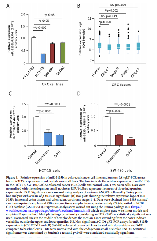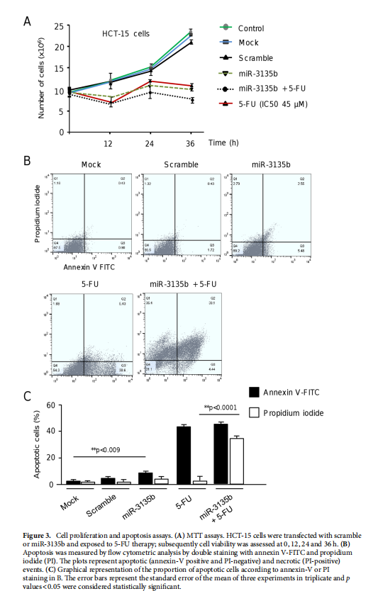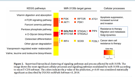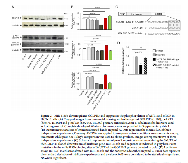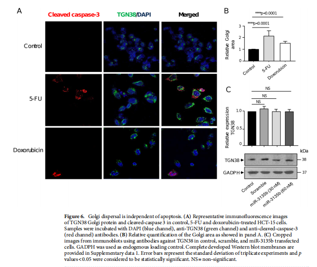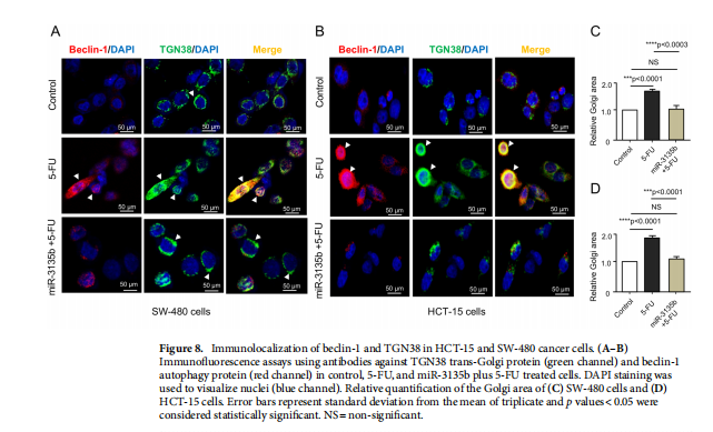 本文为了开始研究 miR-3135b,这是一种位于染色体 6p21.32 中的非编码 RNA,以前没有参与人类癌症,我们使用干环 qRT-PCR 测定分析了其在三个 CRC 细胞系和正常结肠细胞中的表达水平。实验结果表明,MicroRNA-3135b表达在结直肠癌细胞和肿瘤中受到抑制(见图一)。为了研究 miR-3135b 的功能,我们通过使用 TargetScan 和 miRmap 软件进行生物信息学分析来搜索其潜在的基因靶标和相关的信号通路。实验结果进一步显示,MicroRNA3135b预计可调节参与高尔基体完整性的基因(见图二)。接下来,我们想知道 miR-3135b 是否可以调节细胞增殖和凋亡,并使 CRC 细胞对 5-FU 治疗敏感。研究结果显示,MicroRNA-3135b损害增殖、细胞周期进程并促进晚期细胞凋亡和坏死(见图三、四)。接下来,评估 miR-3135b 在响应化疗治疗的 GOLPH3 和高尔基体结构调节中的潜在作用。实验结果显示,MicroRNA-3135b减弱高尔基体对治疗的反应(见图五)。为了排除高尔基体片段化可能是由于细胞凋亡激活的可能性,使用共聚焦显微镜对 HCT-15 细胞中的 caspase-3 蛋白进行了免疫检测。研究进一步发现,高尔基体扩散的发生与CRC细胞的凋亡无关(见图六)。为了深入了解 miR-3135b 对药物诱导的高尔基体扩散的保护作用的分子机制,我们使用非- 处理、模拟和混杂转染的 HCT-15 细胞,以及用单独的 miR-3135b 模拟物或与 5-FU 组合转染的细胞。结果表明,MicroRNA-3135b靶向GOLPH3/AKT/mTOR轴(见图七)。作者假设促存活的自噬途径可以反过来被激活以响应化疗,这可能导致高尔基体片段的再循环,从而使癌细胞能够存活。结果显示。高尔基体扩散与自噬激活有关(见图八)。