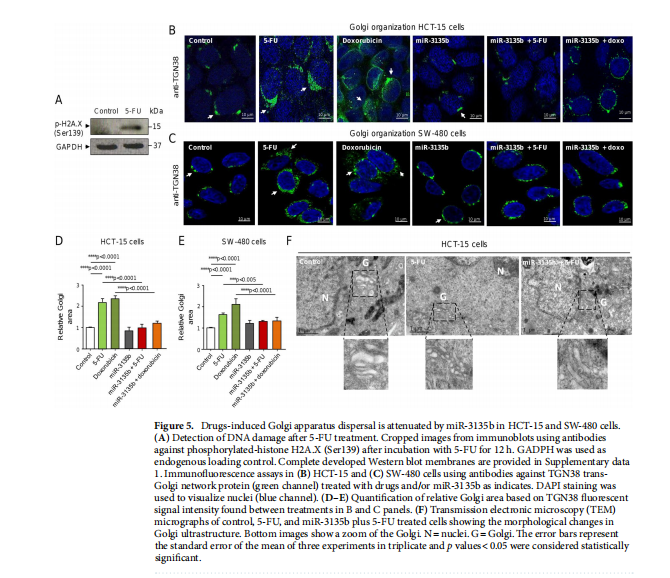 在本研究中,作者研究了miR-3135b在响应5-FU和多柔比星药物时在高尔基体结构完整性和促存活自噬激活中的保护功能。实验的数据表明miR-3135b是一种新型肿瘤抑制因子,在调节GOLPH3/AKT1/mTOR轴以维持高尔基体完整性方面具有潜在作用,这为DNA损伤的新型细胞质DNA损伤反应的谜题增添了一块拼图。