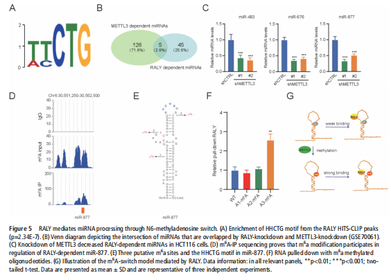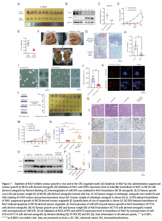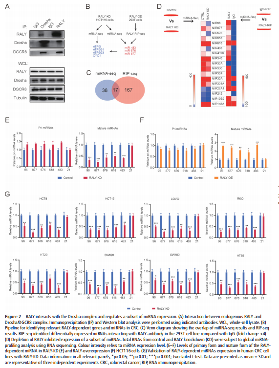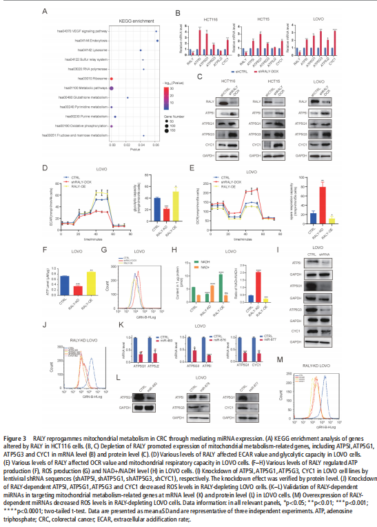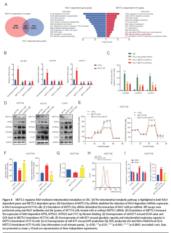 我们分析了结直肠肿瘤进展过程中改变的基因特征,并使用分子和代谢分析的复合物来研究CRC细胞系、人类患者来源的异种移植小鼠模型和肿瘤类器官模型中的代谢调节。我们鉴定了一种新的rna结合蛋白RALY(也称为hnRNPCL2),它与结直肠肿瘤的侵袭性高度相关(见图一)。RALY作为Drosha复合物中的关键调控成分,并促进mirna的一个特定子集(miR-483、miR-676和miR-877)的转录后加工(见图二)。这些miRNAs系统地下调代谢相关基因(ATP5I、ATP5G1、ATP5G3和CYC1)的表达(见图六),从而重新编程癌细胞中的线粒体代谢(见图三)。对癌症基因组图谱(TCGA)的分析显示,在表达低水平线粒体相关基因的CRC患者中,RALY水平的升高与不良预后相关(见图四、图五)。在机制上,在活性氧(ROS)应激下,其n6-甲基腺苷开关促进了这些mirna的诱导加工(见图三)。抑制m6a甲基化可以消除对pri-miRNAs末端环的RALY识别。RALY的敲除可抑制体内和类器官模型中结直肠肿瘤的生长和进展(见图七、图八)。