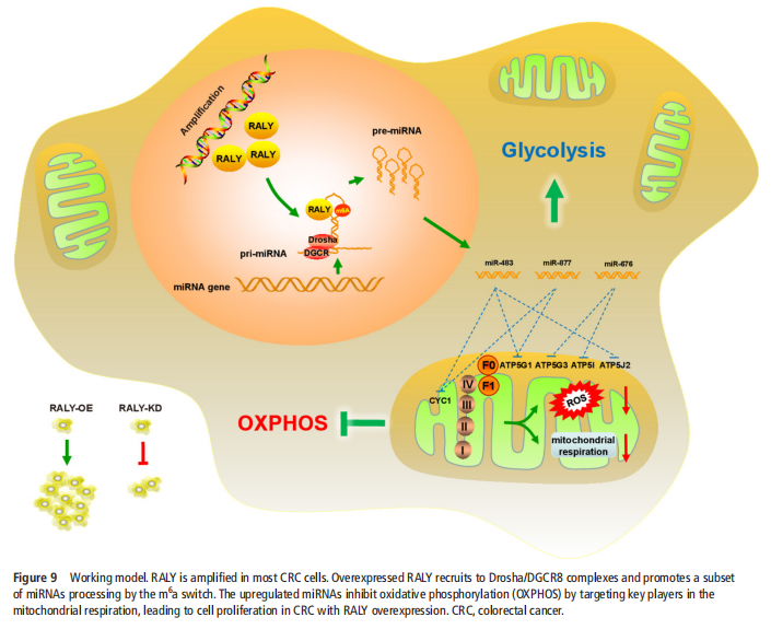 对全基因组miRNA表达谱的系统分析表明,miRNA表达异常有助于细胞转化和肿瘤进展。3637发现miRNA的茎-环结构对Drosha介导的切割至关重要。当前的研究,包括本研究,已经表明RNA结合蛋白赋予了招募和处理个体miRNAs的特异性。从Drosha微处理器复合体中鉴定出的RNA结合蛋白越来越多,其中包括异质核核糖核蛋白家族成员,包括hnRNPA1、hnRNPA2B1、hnRNPK和hnRNPL。在本研究中,确定了hnRNP的一个新成员RALY,该成员与CRC分期和侵袭性高度相关,与Drosha复合体相互作用,并促进miR-483、miR-676和miR-877等miRNAs亚群的表达。此前,有报告称miR-483参与了多种癌症的发生和侵袭。作者发现,这些依赖RALY的miRNAs下调了ETC基因、ATP5I、ATP5G1、ATP5G3和CYC1,并介导了CRC细胞中线粒体代谢的重编程,这为表观遗传调控和线粒体代谢之间的联系提供了功能性联系。本文的结果表明,在CRC细胞中,对RALY的抑制会破坏ATP的产生,诱导ROS水平并增加NAD+/NADH比率,而在RALY耗竭的细胞中过度表达miR-483、miR-676和miR-877可挽救代谢现象类型。我们在RALY缺失的细胞中进一步敲除了相关的ETC基因,并证实了RALY在OXPHOS中的代谢中枢效应主要是由这些ETC基因介导的(见图九)