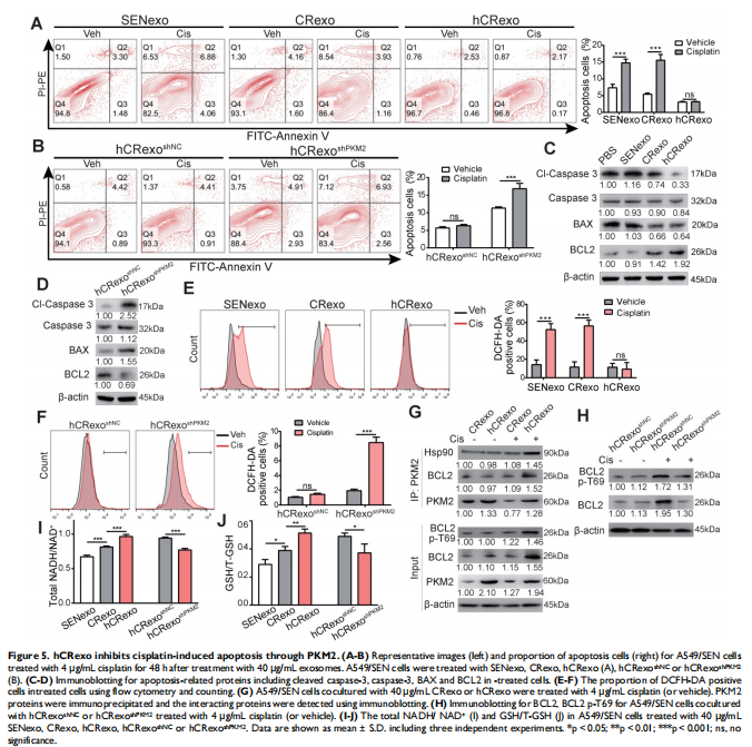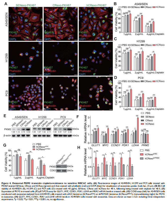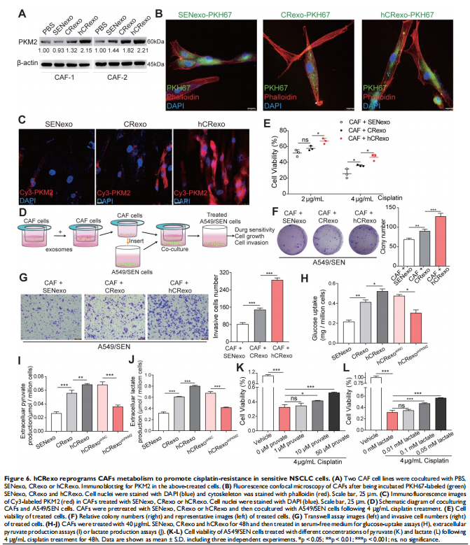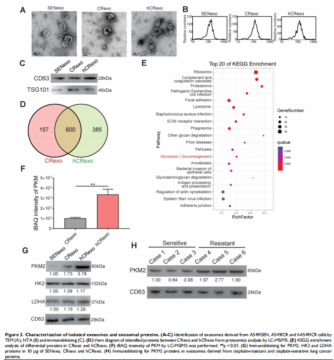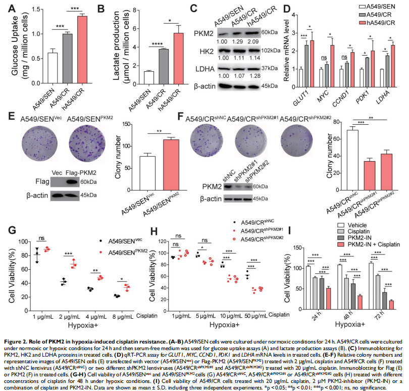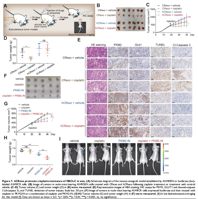 本研究通过将NSCLC细胞置于常氧或缺氧条件下以评估细胞存活率和关键蛋白表达水平的变化。进行比较蛋白质组学以鉴定常氧或缺氧顺铂耐药性NSCLC细胞衍生的外泌体中的外泌体PKM2。体外和体内实验评估了缺氧诱导的外泌体PKM2在促进NSCLC细胞顺铂耐药中的作用,并进行一系列检查证明了缺氧诱导的外泌体PKM2的分子机制。进行了一系列体外实验以评估缺氧诱导的外泌体对癌症相关成纤维细胞(CAF)的作用。结果显示,由于在缺氧顺铂耐药细胞分泌的外泌体中观察到PKM2表达增加(见图二),缺氧加剧了肺癌细胞的顺铂耐药(见图一)。作者发现缺氧诱导的外泌体PKM2(见图三)在体外和体内将顺铂耐药性传递给敏感的NSCLC细胞(见图四)。从机制上讲,缺氧诱导的外泌体PKM2促进NSCLC细胞中的糖酵解产生还原性代谢物,这可能会中和顺铂诱导的活性氧(ROS)。此外,缺氧诱导的外泌体PKM2以PKM2-BCL2依赖性方式抑制细胞凋亡(见图五)。此外,缺氧诱导的外泌体PKM2重编程CAFs以创造促进NSCLC细胞增殖和顺铂耐药的酸性微环境(见图六、图七)。