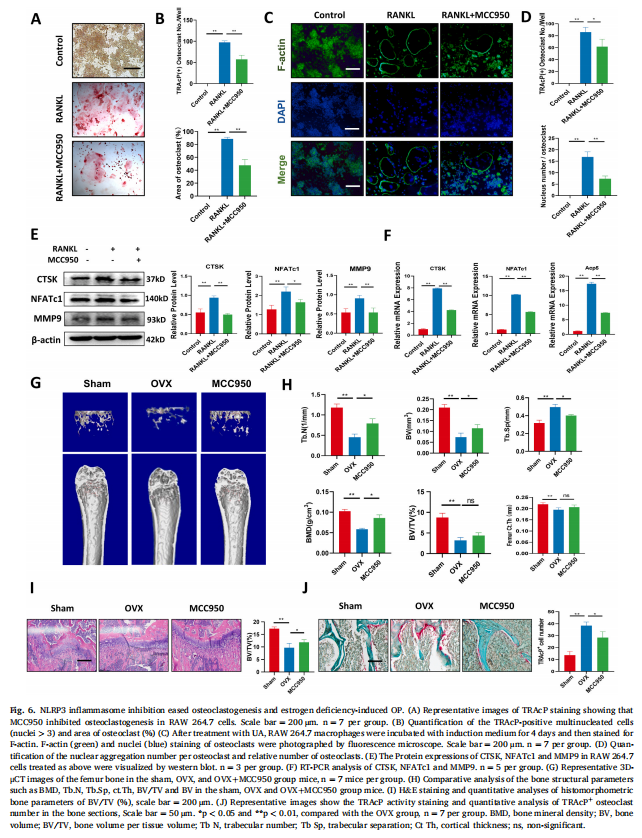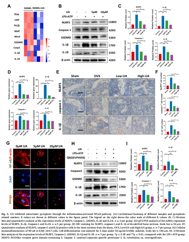 本研究通过卵巢切除术建立了小鼠OP模型,然后用UA治疗OVX小鼠。实验结果显示,UA减少了小鼠卵巢切除术引起的骨质流失(见图一、图二)。作者通过在体外进行了各种细胞干预试验,研究结果表明,UA在体外抑制破骨细胞分化和肌动蛋白带形成(见图三)。为了进一步阐明UA抑制破骨细胞功能的具体机制,在有或没有UA(10 μM)处理的RAW264.7细胞中进行了全转录组RNAseq。两组细胞均用50 μM RANKL处理。研究结果进一步表明,UA抑制促炎细胞因子基因表达和巨噬细胞极化(见图四);UA通过炎症激活的NF-κB通路抑制破骨细胞焦亡(见图五)。考虑到NLRP3炎症小体是导致细胞焦亡的关键因素,作者推测靶向该寡聚体可能构成绝经后OP的潜在治疗方法,选择了MCC950(一种强效的NLRP3抑制剂)并确定了这种小分子的影响。实验结果显示,NLRP3炎症小体抑制缓解破骨细胞生成和雌激素缺乏诱导的OP(见图六)。