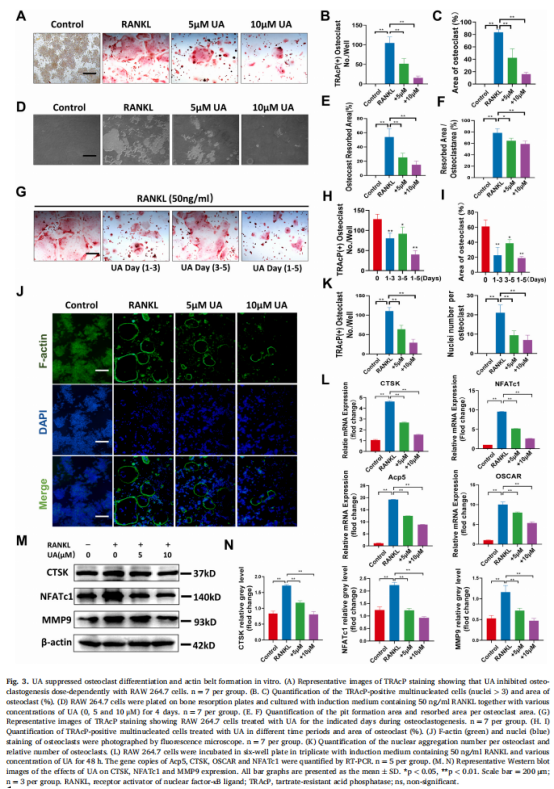 UA作为ET和EA的肠道微生物代谢物发挥作用。越来越多的证据表明,肠道微生物群的代谢调节与骨稳态高度相关。UA是肠道菌群的代谢产物,值得进一步研究。在本研究中,作者发现UA在体内阻止卵巢切除术诱导的OP的进展。在体外,在用50 ng/ml RANKL刺激后,破骨细胞活性被UA处理以浓度依赖性方式大大抑制,从而导致随后NFATc1表达的减弱,这与Weske的工作一致。