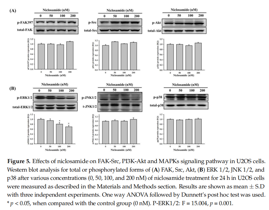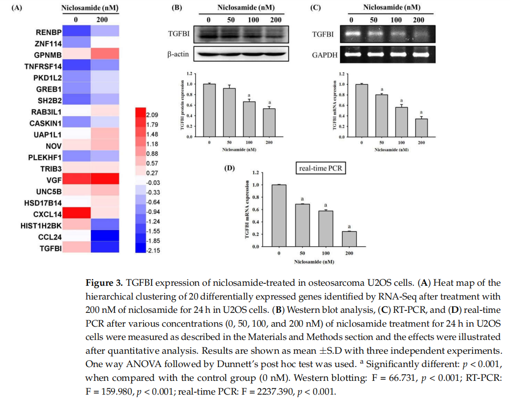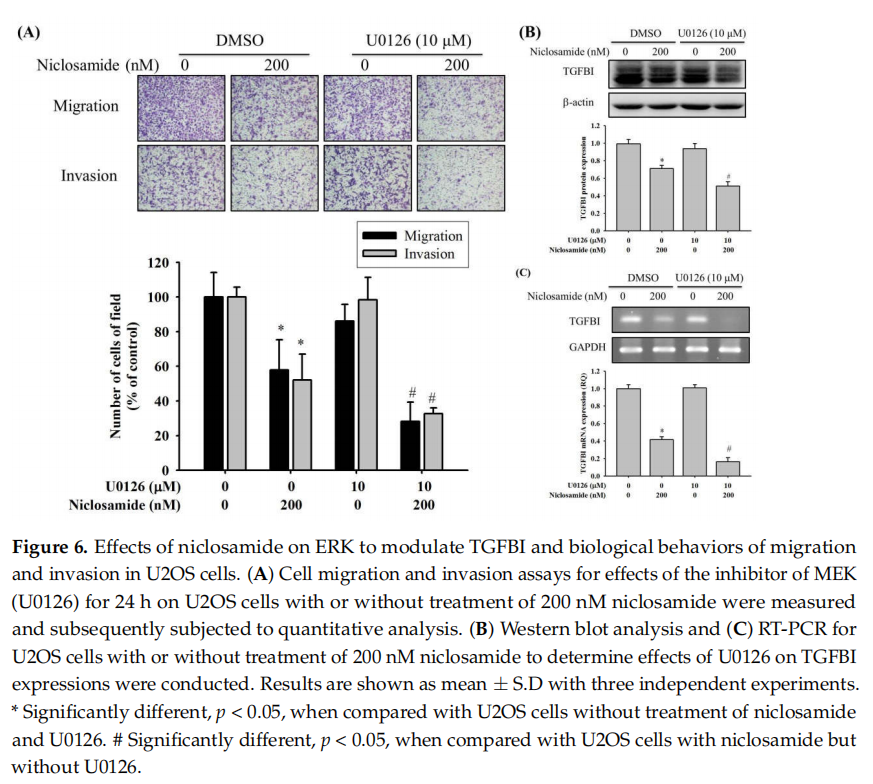 本研究通过氯硝柳胺对U2OS和HOS细胞系骨肉瘤进行处理。实验结果表明,氯硝柳胺对U2OS和HOS骨肉瘤细胞的细胞毒性(见图一);氯硝柳胺抑制U2OS和HOS细胞的运动、迁移和侵袭(见图二);氯硝柳胺降低U2OS细胞的TGFBI表达(见图三);TGFBI敲低减少U2OS细胞的迁移和侵袭(见图四);氯硝柳胺抑制U2OS细胞中的ERK信号通路(见图五、图六)