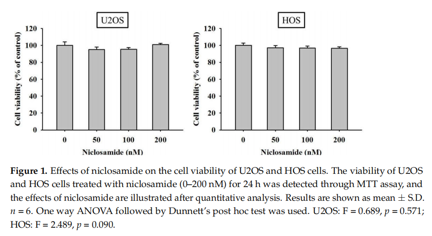氯硝柳胺是一种全身给药的多功能药物。氯硝柳胺被反复证明对各种癌症表现出有效的抗癌活性,包括骨肉瘤。具体而言,氯硝柳胺通过靶向多种信号通路(包括E2F1、AP-1和c-Myc的转录活性)诱导骨肉瘤细胞凋亡和G1期阻滞并抑制细胞周期进程。氯硝柳胺还抑制人骨肉瘤细胞的小鼠异种移植模型中的肿瘤生长。