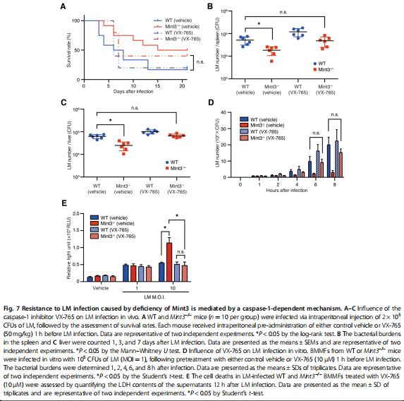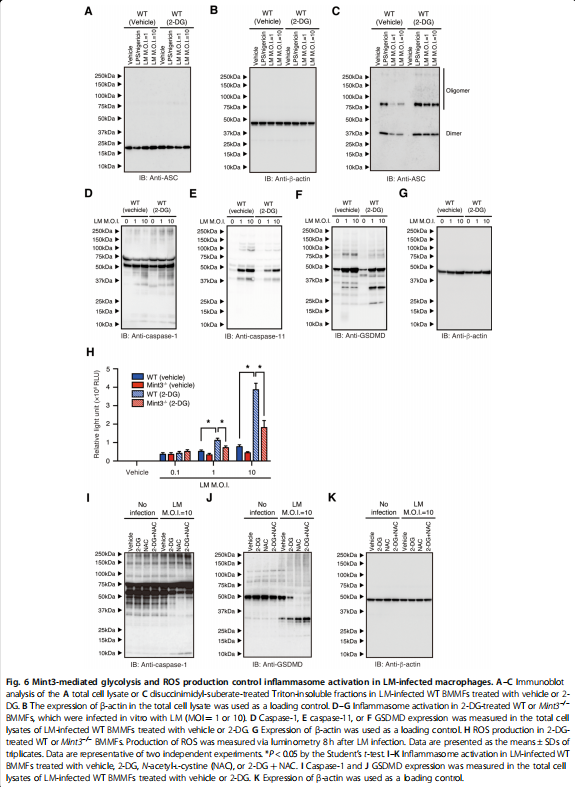 为了确定Mint3是否有助于LM感染期间的免疫反应,本研究通过在野生型(WT:C57BL/6)和Mint3–/–小鼠中注射致死剂量的LM进行体内研究。体内研究结果显示,Mint3耗竭不仅可减轻小鼠严重李斯特菌病(见图一),也可减弱巨噬细胞内的LM生长(见图二),还会导致LM感染的巨噬细胞中ROS产生减少和细胞死亡增加(见图三)。进一步进行体外实验,体外实验结果表明,Mint3缺乏促进巨噬细胞中的炎症小体活化(见图四);抑制糖酵解促进细胞焦亡并赋予巨噬细胞对LM感染的抵抗力(见图五);Mint3介导的糖酵解和ROS产生控制LM感染的巨噬细胞中的炎症小体活化(见图六);对Mint3缺乏引起的LM感染的抵抗需要活化的caspase-1(见图七)。
