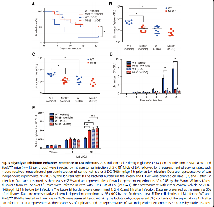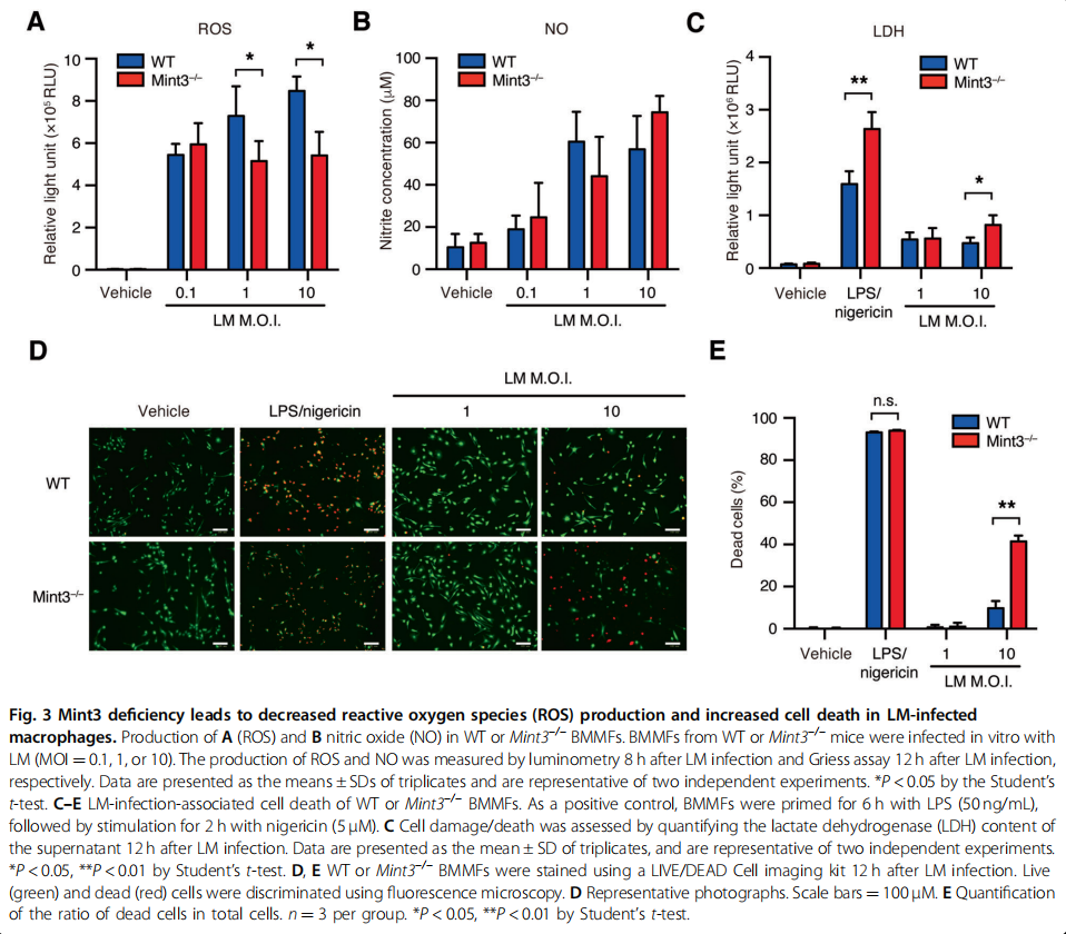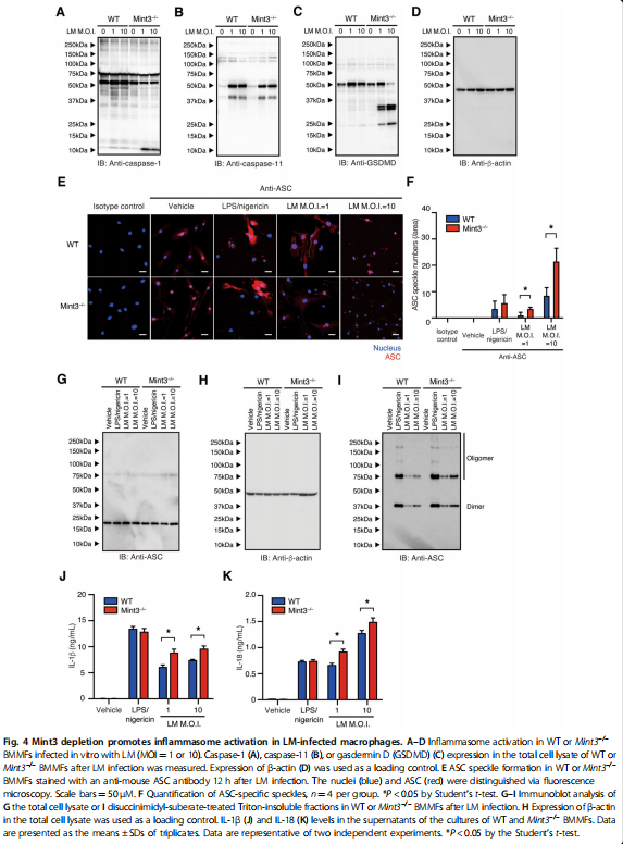 在这里,本研究结果表明Mint3介导的途径导致小鼠严重李斯特菌病。具体而言,在从Mint3–/–小鼠分离的LM感染的巨噬细胞中,GSDMD的caspase-1依赖性加工得到增强,并伴有强烈的细胞焦亡诱导。在LM感染的巨噬细胞中,Mint3消耗通过抑制糖酵解依赖性炎症小体失活和ROS依赖性caspase-1失活来促进细胞焦亡和LM清除。因此,LM感染后细菌清除率增强,与WT小鼠相比,感染后Mint3-/-小鼠的存活率增加(见图八)。总之,这些发现表明,Mint3可能通过整合糖酵解和ROS产生,在LM感染期间作为炎症小体激活和细胞焦亡的负调节因子。