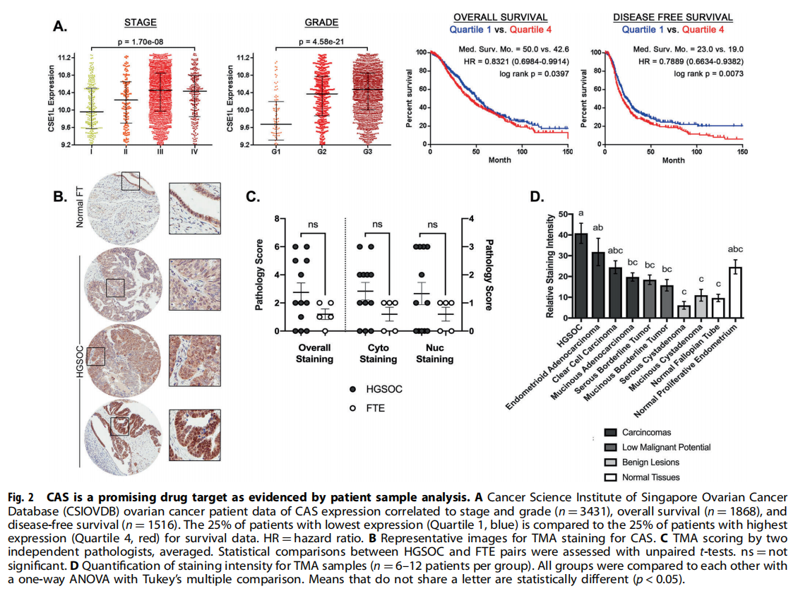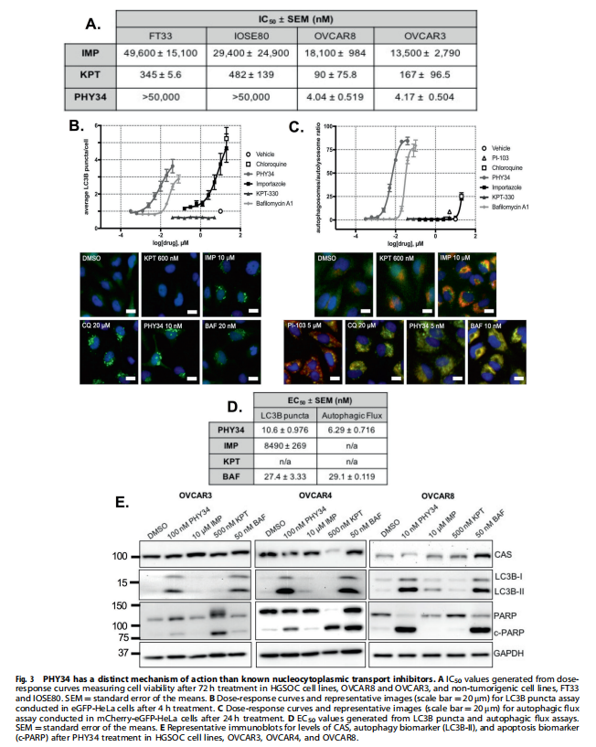 Phyllanthusmins (PHYs)是一类最初从叶下珠属中分离出来的二叶黄素抗癌化合物,启发了合成类似物PHY34的产生。PHY34在体外对卵巢癌细胞系具有细胞毒性,并通过晚期自噬抑制和细胞凋亡降低体内HGSOC肿瘤负荷。特别是卵巢癌已被证明具有最受破坏的自噬途径,以及代偿性蛋白水解途径。CAS(也称为CSE1L或XPO2)具有许多作用,包括其作为α-输入蛋白的核输出者的作用,以及在增殖、凋亡和细胞分裂、表观遗传沉默、和微泡形成。CAS将α-输入蛋白从细胞核转运到细胞质中,用于核输入。